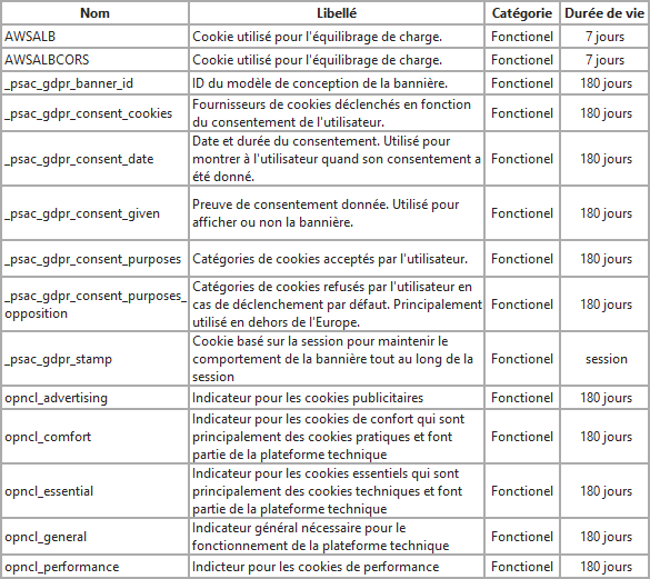 La première fois que vous accédez à notre site web, vous êtes informé par une bannière vous notifiant l'utilisation de cookies et les catégories de cookies utilisées. Les différents cookies sont décrits ci-dessous.