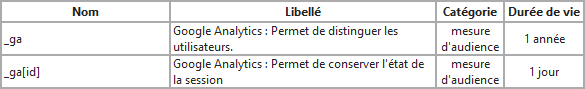 Vous trouverez ici la description des cookies d'audience, de performance et de suivi utilisés sur notre site web :